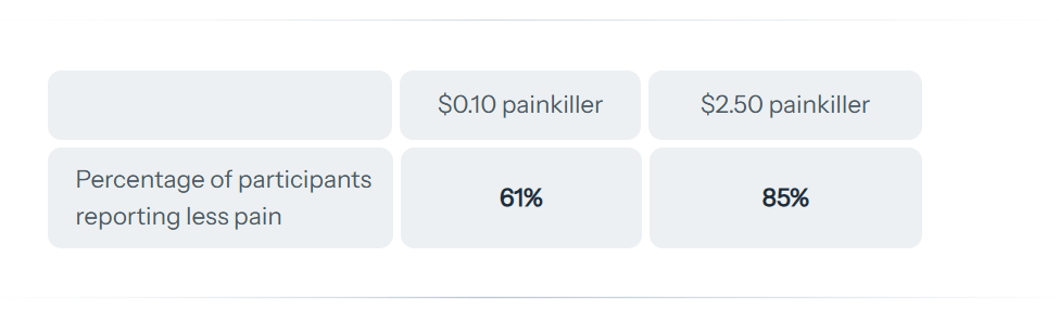 Half of the participants were told the painkiller cost $2.50, and then the other was told it cost $0.10. So, it was the same painkiller, just different pricing.